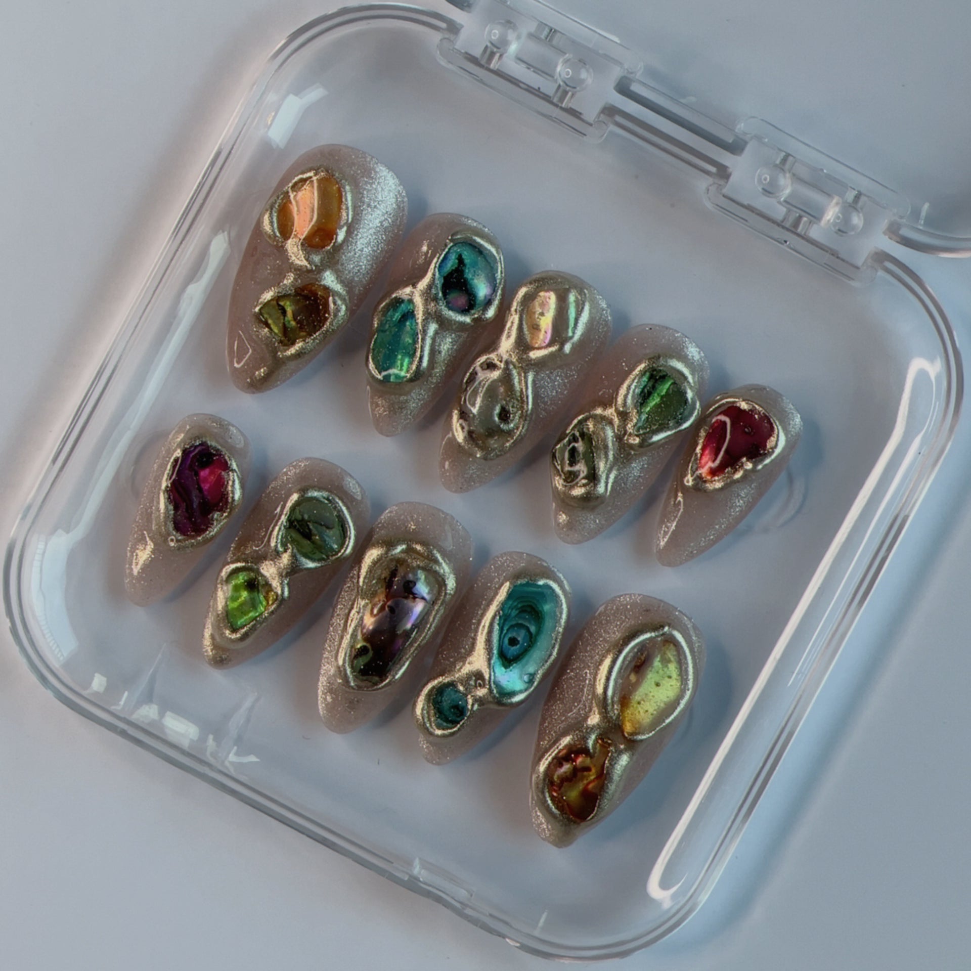 A dreamy set inspired by shimmering auroras and molten gemstone ore. Each nail is completely handmade with glowing color shifts and raised chrome details.
